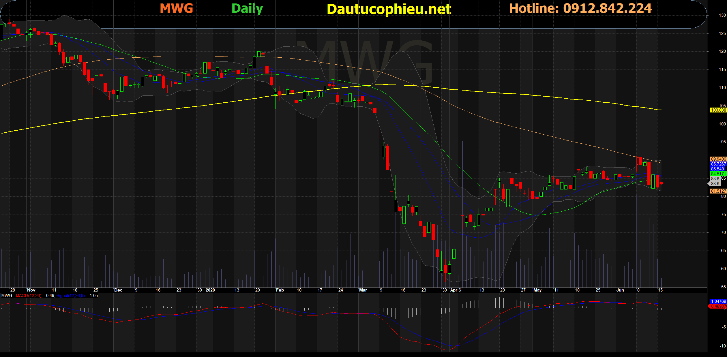 Đồ thị cổ phiếu MWG phiên giao dịch ngày 16/06/2020. Nguồn: AmiBroker