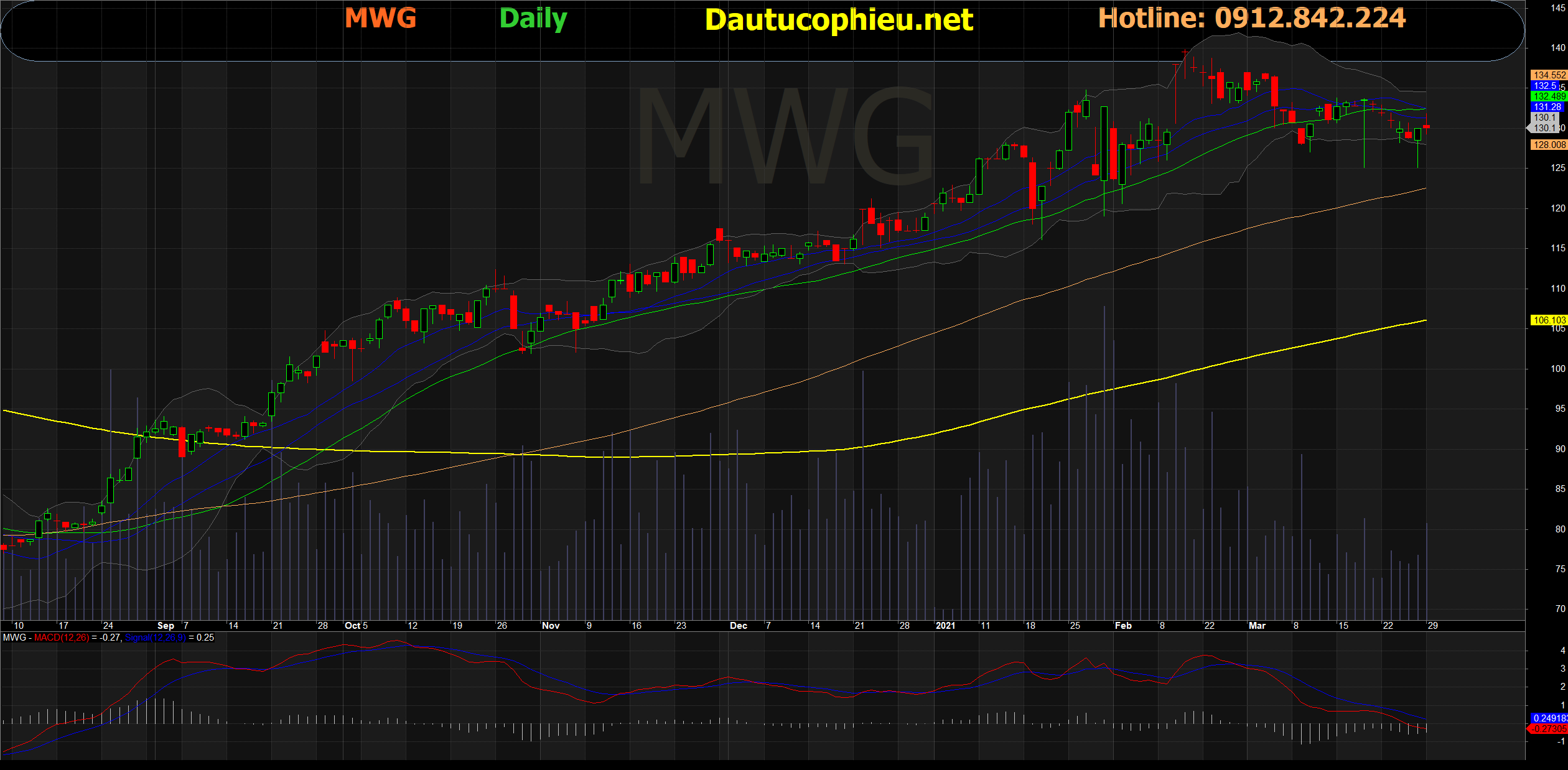 Đồ thị cổ phiếu MWG phiên giao dịch ngày 29/03/2021. Nguồn: AmiBroker