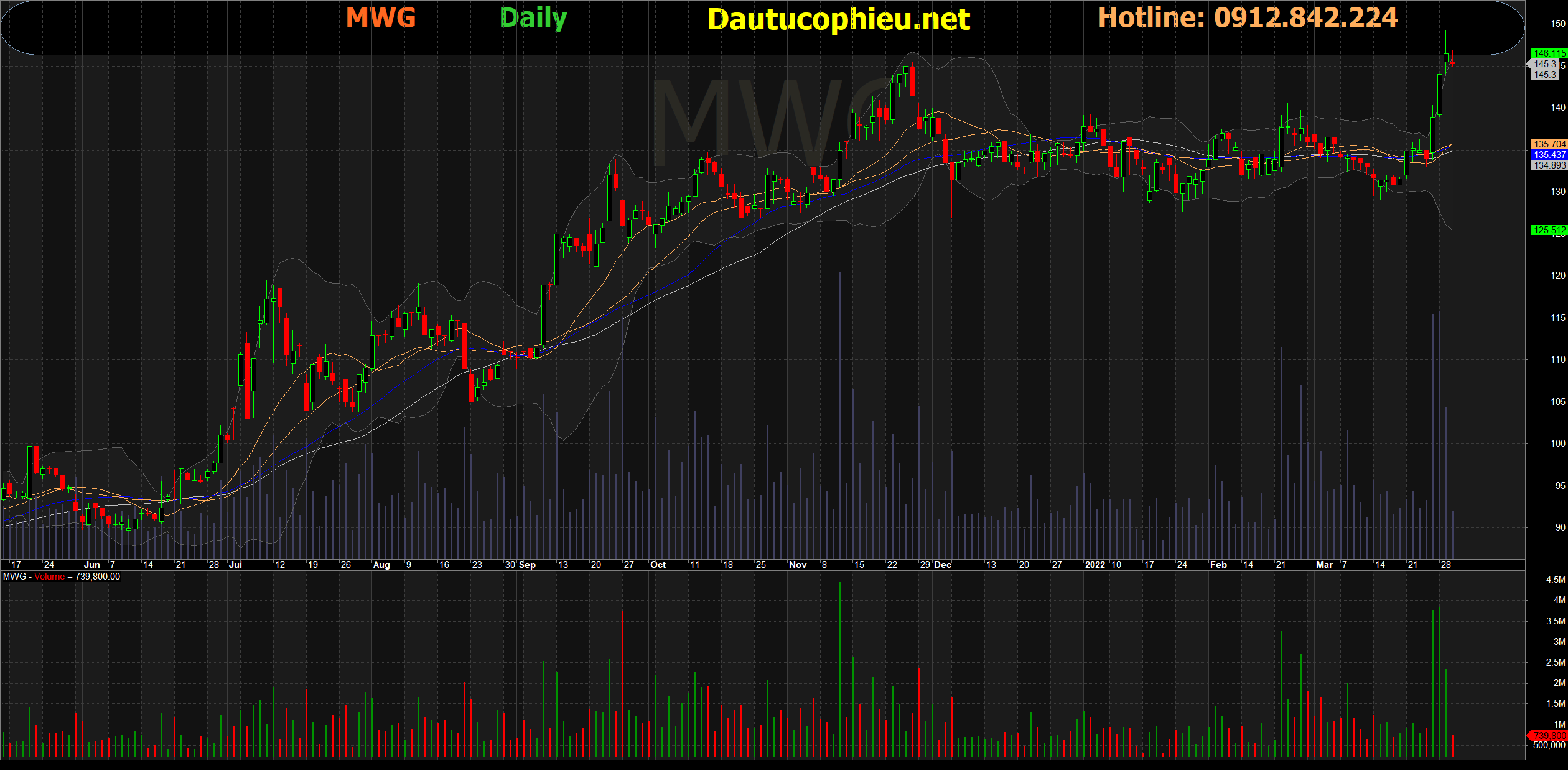 Đồ thị cổ phiếu MWG phiên giao dịch ngày 30/03/2022. Nguồn: AmiBroker