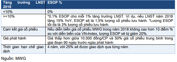 Khi LNST 2017 tăng mạnh 40% YoY và giá cổ phiếu trung bình của MWG năm 2017 đã vượt VN-Index hơn 10 điểm %, MWG sẽ phát hành ESOP 3% cho năm 2017 sau khi được phê duyệt tại ĐHCĐ thường niên trong năm 2017. Cụ thể, công ty sẽ phát hành 9,7 triệu cổ phiếu ESOP trong tháng 12/2018.