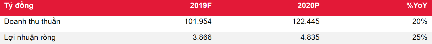 Chúng tôi duy trì ước tính doanh thu thuần và lợi nhuận ròng năm 2020 ở mức 129.313 tỷ đồng (+ 27% YoY) và 5.516 tỷ đồng (+ 32% YoY).
