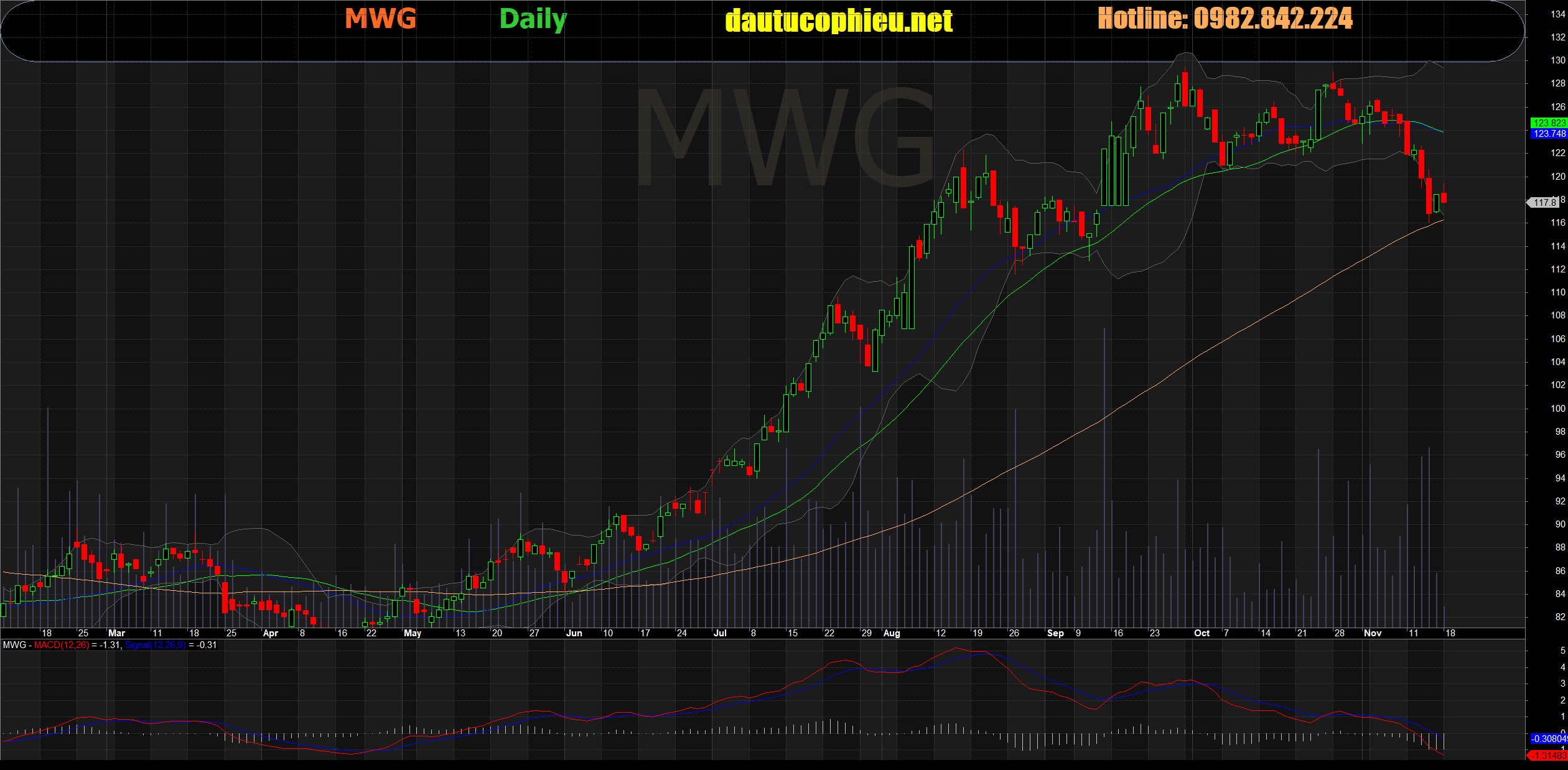 Đồ thị cổ phiếu MWG phiên giao dịch ngày 18/11/2019. Nguồn: AmiBroker.