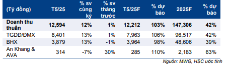 MWG công bố doanh thu thuần 5 tháng đầu năm 2025 đạt 61.229 tỷ đồng, tăng 13% so với cùng kỳ, nhờ doanh thu của chuỗi TGDĐ & ĐMX và BHX vững chắc lần lượt ở mức 40.987 tỷ đồng (tăng 11% so với cùng kỳ) và 18.859 tỷ đồng (tăng 19% so với cùng kỳ).
