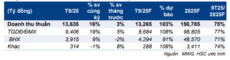 Doanh thu tháng 9/2025 của MWG đạt 13.635 tỷ đồng, tăng 16% so với cùng kỳ và tăng 3% so với tháng trước, vượt 3% so với dự báo của HSC (13.265 tỷ đồng). Tăng trưởng so với cùng kỳ đến từ cả hai mảng cốt lõi là chuỗi TGDĐ & ĐMX và chuỗi BHX, trong khi mức tăng so với tháng trước chủ yếu nhờ đà tăng trưởng mạnh của chuỗi TGDĐ & ĐMX. Tính chung 9 tháng đầu năm 2025, doanh thu thuần của MWG đạt 113.436 tỷ đồng, tăng 14% so với cùng kỳ, hoàn thành 76% kế hoạch năm của Công ty và 75% dự báo cho cả năm của HSC.