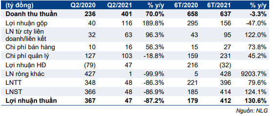 NLG công bố KQKD Q2/2021 với doanh thu đạt 401 tỷ đồng (tăng 65,7% so với cùng kỳ) và lợi nhuận thuần là 47 tỷ đồng (giảm 31,1% so với cùng kỳ). KQKD thấp hơn đáng kể so với dự báo của chúng tôi chủ yếu do Công ty lùi việc bàn giao căn hộ tại dự án Akari.