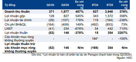 Doanh thu và lợi nhuận 9 tháng đầu năm 2025 đạt lần lượt 3.941 tỷ đồng (tăng 3,8 lần so với cùng kỳ) và 354 tỷ đồng (so với 15 tỷ đồng trong 9 tháng đầu năm 2024), hoàn thành 65% và 54% dự báo cho cả năm 2025 của chúng tôi. Không có khoản mục không thường xuyên đáng kể nào được ghi nhận trong Q3 và 9 tháng đầu năm 2025.