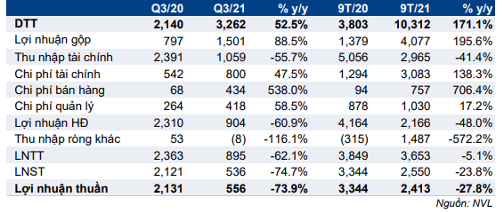 Từ đó, lợi nhuận thuần Q3/2021 của NVL đạt 556 tỷ đồng, giảm 73,9% so với cùng kỳ nhưng cao hơn dự báo của chúng tôi.