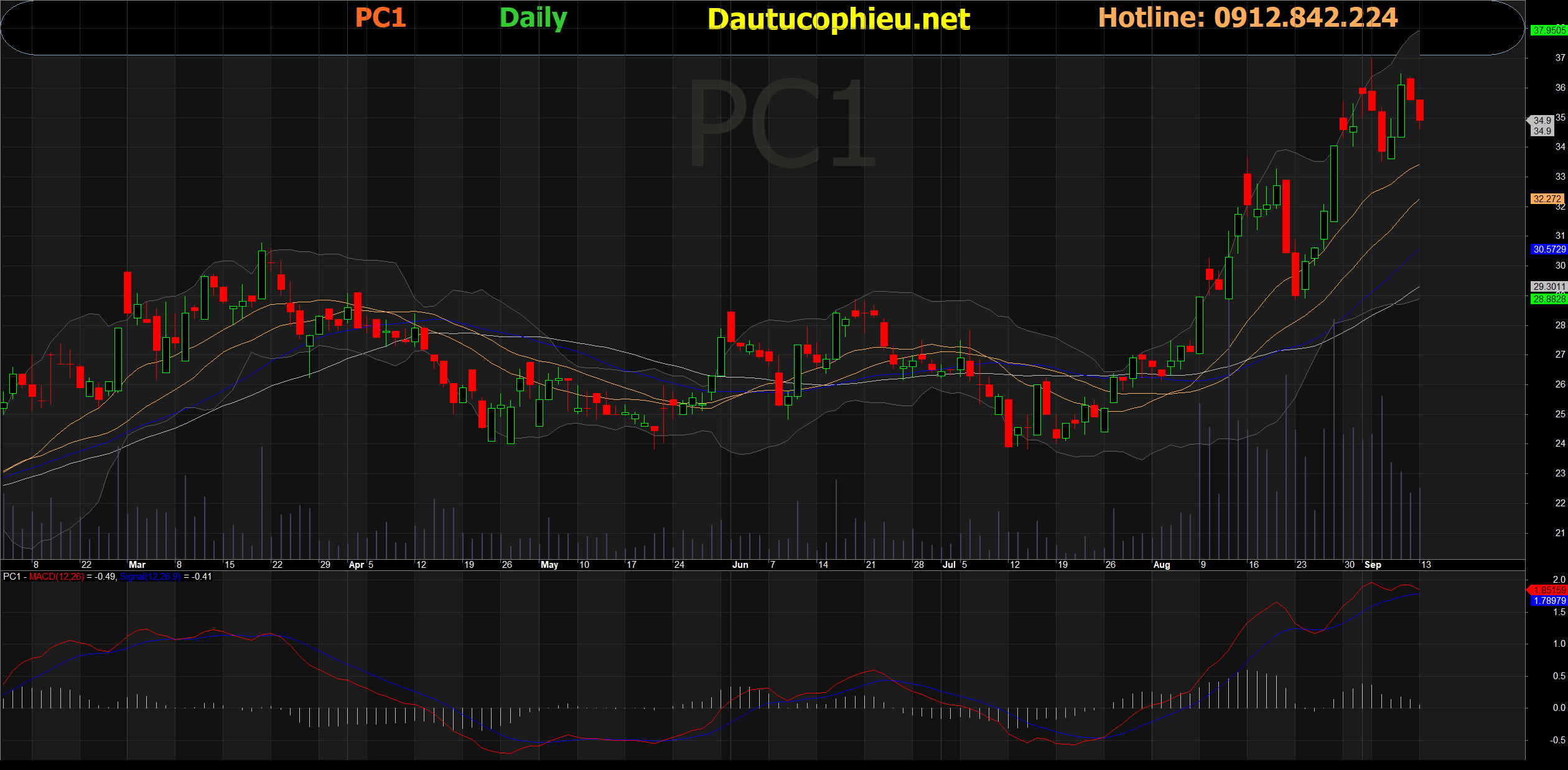Đồ thị cổ phiếu PC1 phiên giao dịch ngày 13/09/2021. Nguồn: AmiBroker