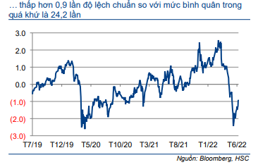 Cổ phiếu PLX giảm mạnh giảm 25% trong 3 tháng qua và hiệu suất kém chỉ số 15%. Kết quả này có thể do ảnh hưởng của việc gián đoạn nguồn cung đối với lợi nhuận của PLX. Sau khi giá cổ phiếu sụt giảm, PLX hiện có định giá hấp dẫn với P/E dự phóng 2022 và 2023 lần lượt là 23,8 lần và 19,1 lần; tương đương P/E trượt dự phóng 1 năm là 21,6 lần, thấp hơn 0,9 lần độ lệch chuẩn so với mức bình quân trong quá khứ là 24,2 lần (kể từ tháng 7/2019) (Biểu đồ 10-11).