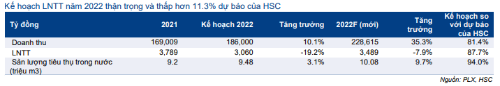Bảng 3: Kế hoạch 2022 so với dự báo của HSC, PLX