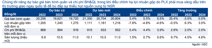 HSC nâng dự báo doanh thu trong năm 2022-2024 sau khi điều chỉnh tăng giả định giá bán bình quân. Chúng tôi cũng nâng dự báo sản lượng tiêu thụ theo hướng dẫn của Chính phủ là PLX sẽ chịu trách nhiệm đẩy mạnh nhập khẩu xăng dầu để bù đắp sự thiếu hụt nguồn cung do NSR giảm sản lượng. Tuy nhiên, HSC hạ dự báo lợi nhuận gộp trên mỗi đơn vị do PLX phải mua xăng dầu trên thị trường giao ngay quốc tế với giá bán cao để bù đắp sự thiếu hụt nguồn cung từ NSR trong 6 tháng đầu năm 2022. Chúng tôi giả định NSR sẽ trở lại hoạt động với 90-100% công suất trong 6 tháng cuối năm 2022.