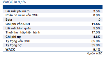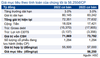 HSC hạ 22% giá mục tiêu xuống 56.250đ (tiềm năng tăng giá 20%) sau khi chúng tôi điều chỉnh giảm dự báo trong giai đoạn 2022-2024 và chuyển giai đoạn cơ sở định giá sang giữa năm 2023. HSC áp dụng lãi suất phi rủi ro là 3,5%, phần bù rủi ro vốn CSH là 8,0%, WACC là 9,1% và tốc độ tăng trưởng dài hạn là 3,0%.