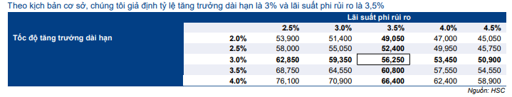 Trong mô hình định giá trước đó trong tháng 3/2022, chúng tôi áp dụng lãi suất phi rủi ro là 3,0%, phần bù rủi ro vốn CSH là 7,0%, WACC là 8,1% và tốc độ tăng trưởng dài hạn là 3,0%. HSC tóm tắt tính toán và giả định cơ sở trong Bảng 6-8 bên dưới. Chúng tôi cũng thực hiện phân tích độ nhạy đối với lãi suất phi rủi ro và tốc độ tăng trưởng dài hạn trong Bảng 9.