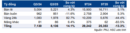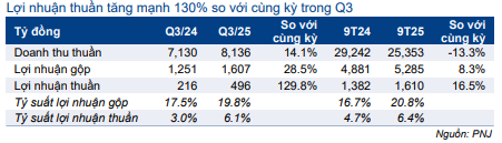 Bảng 1: KQKD Q3/2025 & 9 tháng đầu năm 2025, PNJ