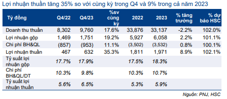 Lợi nhuận thuần Q4/2023 tăng 35% so với cùng kỳ đạt 632 tỷ đồng, cao hơn 7% so với dự báo của chúng tôi là 590 tỷ đồng, và doanh thu thuần đạt 9.760 tỷ đồng (tăng 18% so với cùng kỳ) (Bảng 1). Tính riêng tháng 12/2023, lợi nhuận thuần tăng 42% so với cùng kỳ đạt 237 tỷ đồng và doanh thu thuần đạt 3.559 tỷ đồng, tăng 28% so với cùng kỳ nhờ doanh thu vàng miếng tăng mạnh. Trong khi đó, trong cả năm 2023, lợi nhuận thuần tăng trưởng 2% đạt 1.971 tỷ đồng, so với dự báo của chúng tôi là 1.930 tỷ đồng và doanh thu thuần giảm 2% so với cùng kỳ xuống 33.137 tỷ đồng.