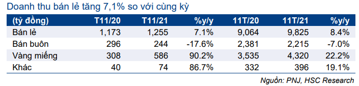 Doanh thu vàng miếng tăng 90% so với cùng kỳ đạt 586 tỷ đồng. Trong 11 tháng đầu năm 2021, doanh thu vàng miếng tăng 22,2% so với cùng kỳ đạt 4.320 tỷ đồng.