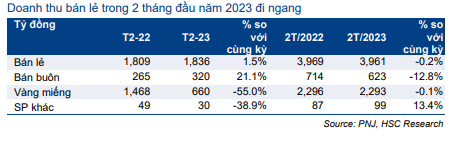 Trong 2 tháng đầu năm 2023, doanh thu bán lẻ gần như đi ngang ở mức 3.961 tỷ đồng (giảm 0,2% so với cùng kỳ); doanh thu bán buôn giảm 12,8% so với cùng kỳ xuống 623 tỷ đồng trong khi doanh thu vàng miếng là 2.293 tỷ đồng (giảm 0,1% so với cùng kỳ).
