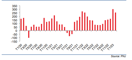 Doanh thu thuần tháng 2/2023 giảm 20,7% so với cùng kỳ xuống 2.847 tỷ đồng, do doanh thu vàng miếng giảm, trong khi lợi nhuận thuần tháng 2/2023 tăng nhẹ 0,8% so với cùng kỳ đạt 254 tỷ đồng.