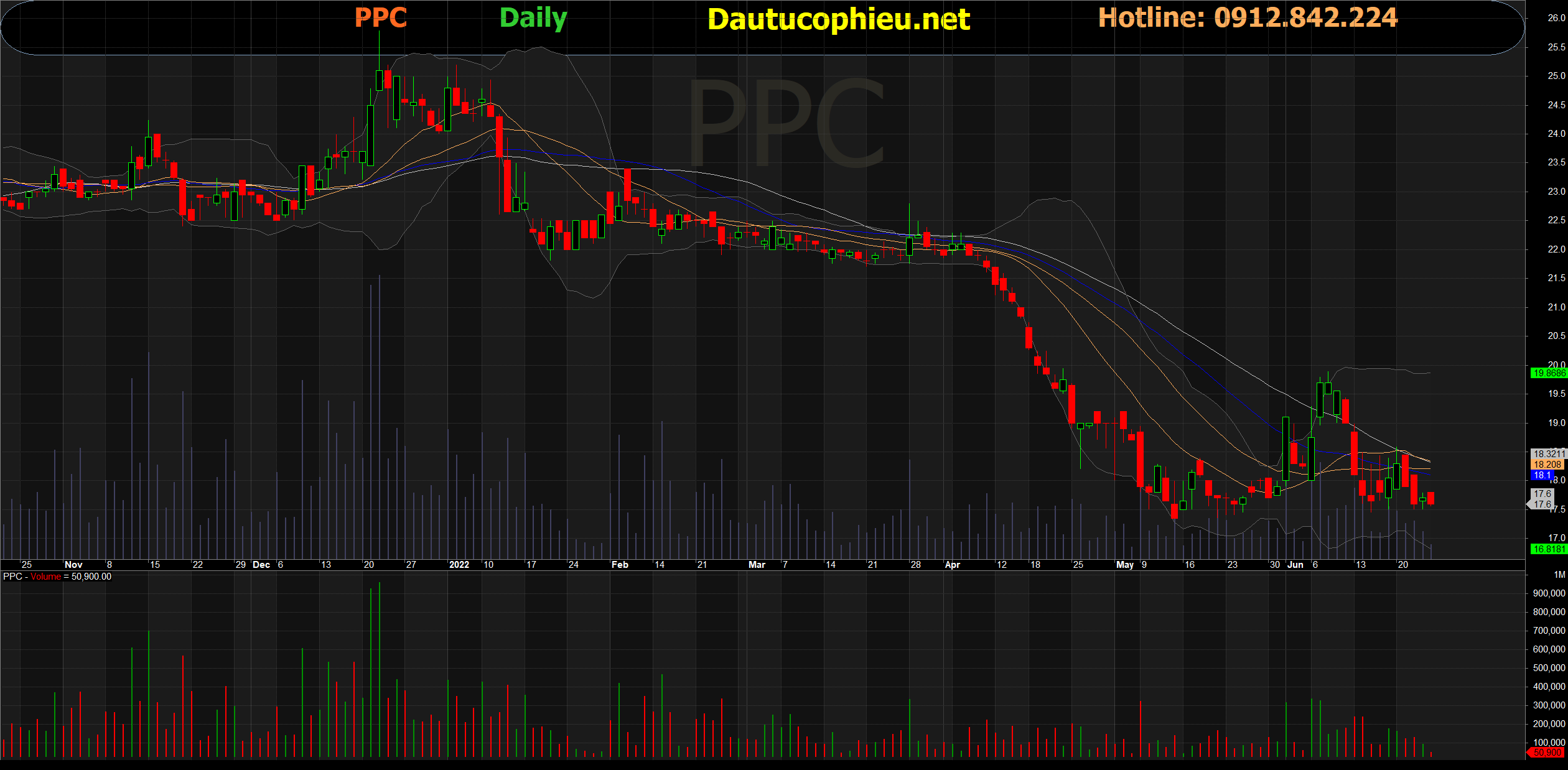 Đồ thị cổ phiếu PPC phiên giao dịch ngày 24/06/2022. Nguồn: AmiBroker