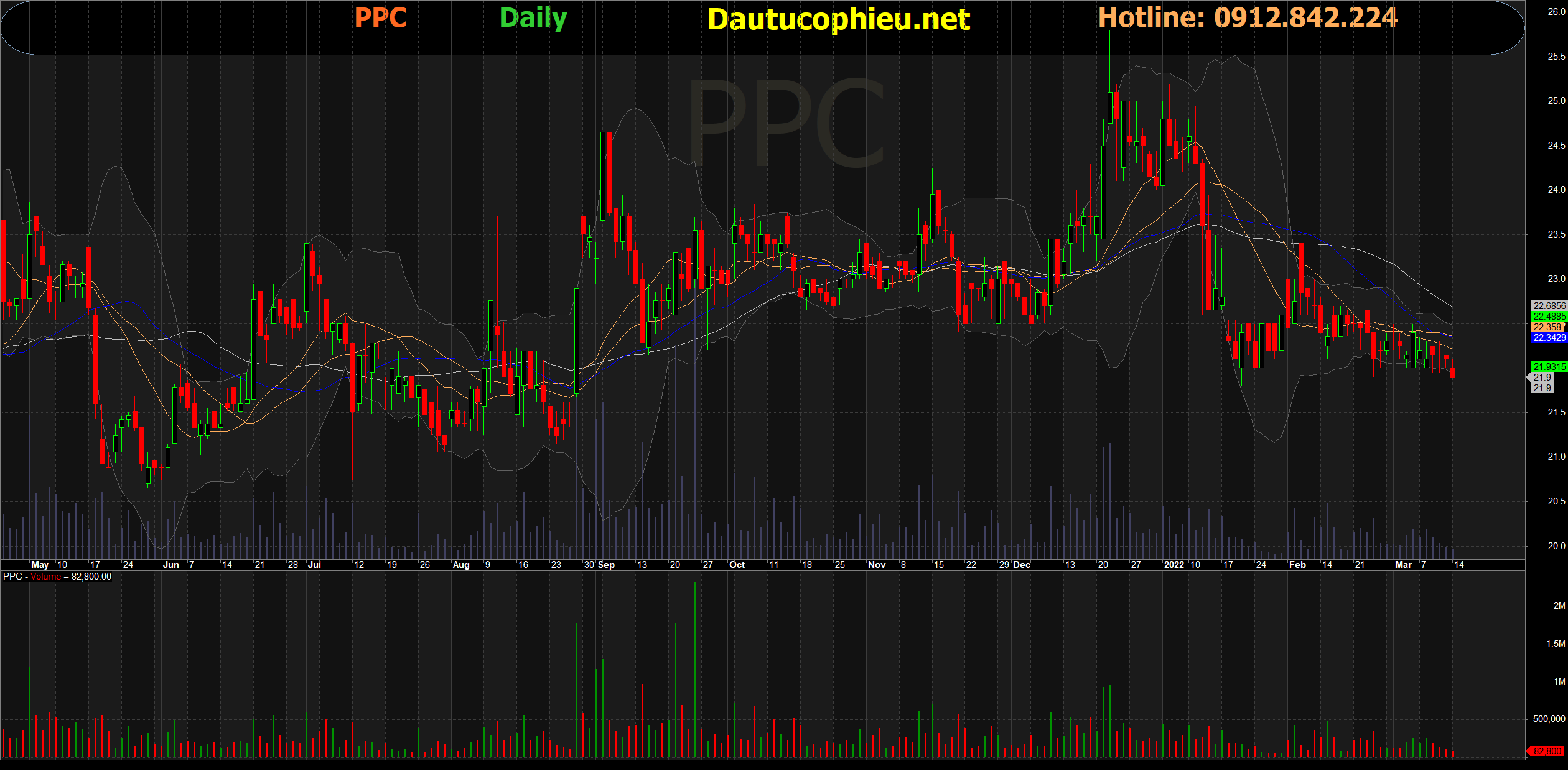 Đồ thị cổ phiếu PPC phiên giao dịch ngày 14/03/2022. Nguồn: AmiBroker