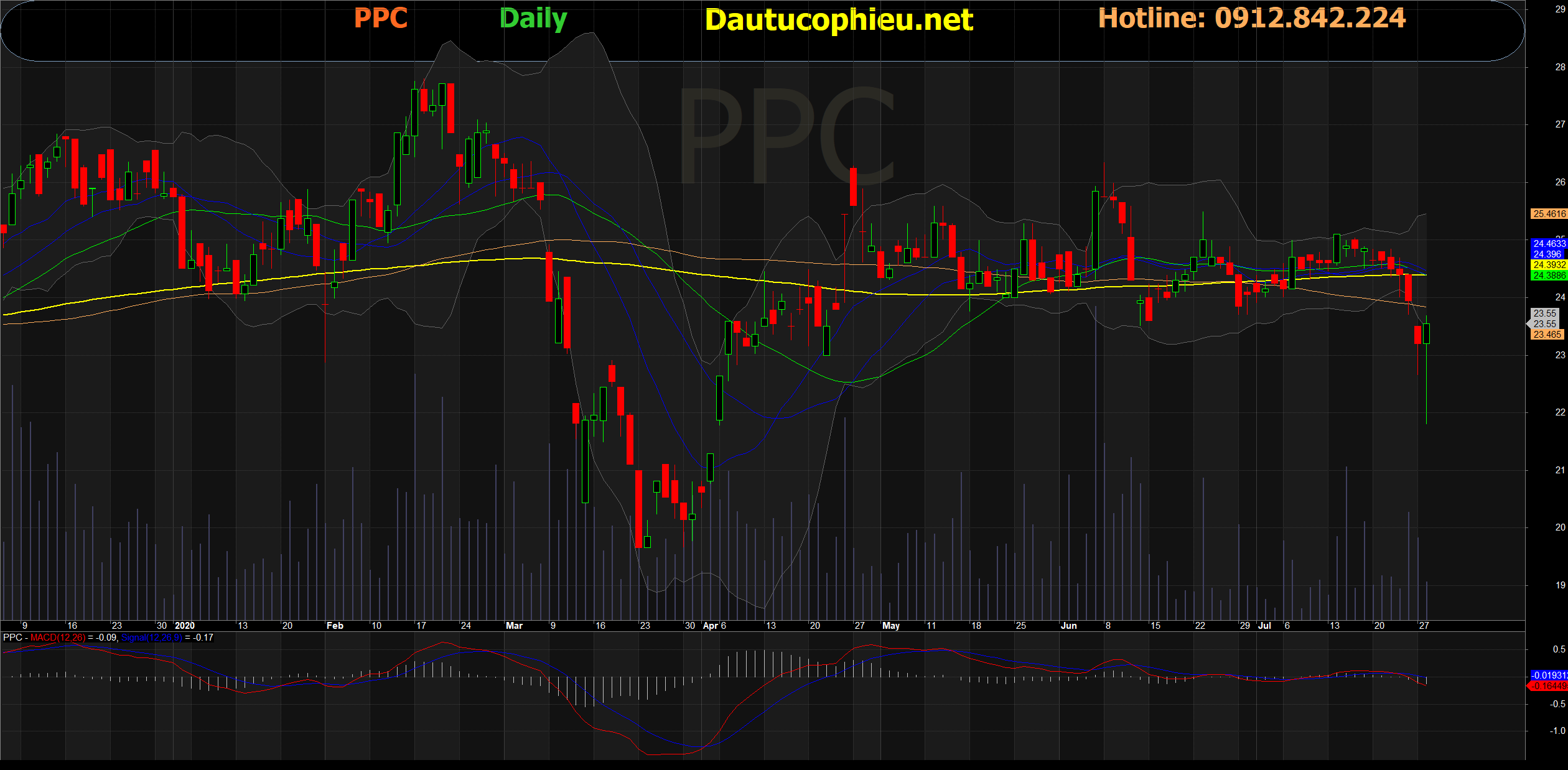 Đồ thị cổ phiếu PPC phiên giao dịch ngày 28/07/2020. Nguồn: AmiBroker