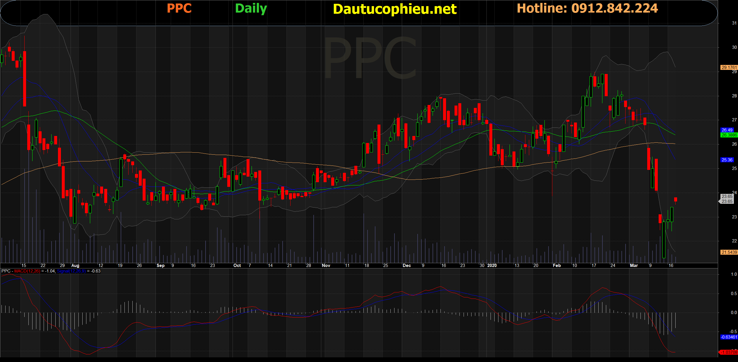 Đồ thị cổ phiếu PPC phiên giao dịch ngày 18/03/2020. Nguồn: AmiBroker.