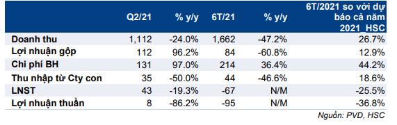 Lợi nhuận Q2/2021 giảm 86,2% so với cùng kỳ xuống 8 tỷ đồng do doanh thu giảm 24% so với cùng kỳ xuống 1.112 tỷ đồng. Lợi nhuận thực tế thấp hơn so với kỳ vọng dự báo Q2/2021 của chúng tôi là 63 tỷ đồng do hiệu suất hoạt động thấp hơn kỳ vọng, thu nhập từ liên doanh yếu và khoản nợ khó đòi do KrisEnergy phá sản.