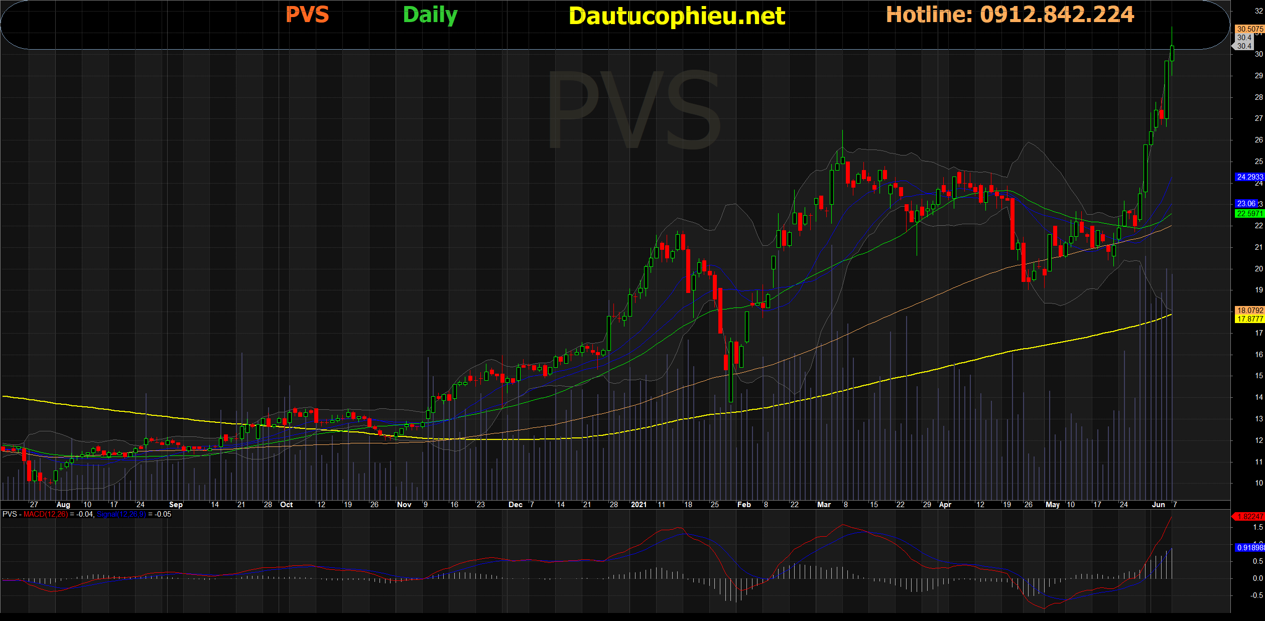 Đồ thị cổ phiếu PVS phiên giao dịch ngày 07/06/2021. Nguồn: AmiBroker