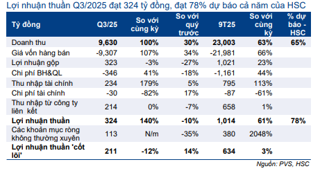 Loại trừ các tác động của tỷ giá, lợi nhuận thuần cốt lõi Q3/2025 kém tích cực, chỉ đạt 211 tỷ đồng (giảm 12% so với cùng kỳ nhưng tăng 14% so với quý trước). Trong khi đó, lợi nhuận thuần Q3/2025 đạt 324 tỷ đồng (tăng 140% so với cùng kỳ từ mức nền thấp). Tính chúng 9 tháng đầu năm 2025, lợi nhuận thuần của PVS đạt 1 nghìn tỷ đồng, tăng 61% so với cùng kỳ và hoàn thành 78% dự báo cho cả năm của HSC.