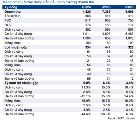 Doanh thu mảng cơ khí & xây dựng tăng 29% so với cùng kỳ (tăng 33% so với quý trước) đạt 6,4 nghìn tỷ đồng nhờ khối lượng công việc tại các dự án dầu khí và năng lượng tái tạo tăng cao. Tỷ suất lợi nhuận gộp của mảng cơ khí và xây dựng trong quý 3 đáng thất vọng, chỉ đạt 0,4% (so với 3,5% trong quý 2). Chúng tôi cho rằng đây là kết quả của việc vốn đầu tư được ghi nhận trong kỳ để nâng cấp hạ tầng cảng để đẩy nhanh tiến độ đầu tư. Mặt khác, lợi nhuận từ các liên doanh FSO ổn định ở mức 214 tỷ đồng (không đổi so với cùng kỳ và giảm 7% so với quý trước).