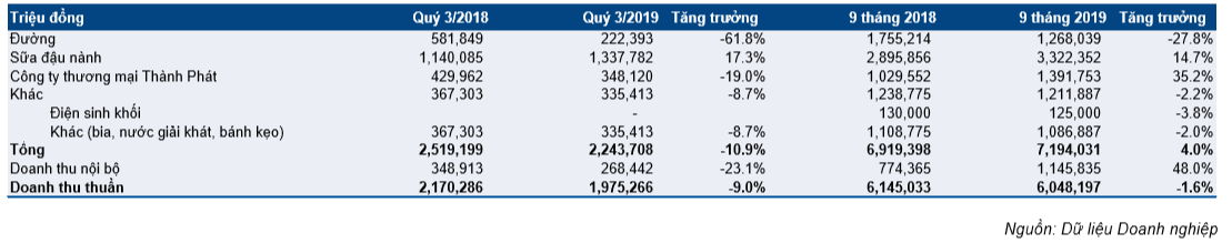 - Doanh thu đường giảm đáng kể 61,8% so với cùng kỳ, do sản lượng tiêu thụ giảm 65% so với cùng kỳ xuống 20.000 tấn, sau khi sản lượng ép mía đường trong mùa vụ từ tháng 12/2018 đến tháng 4/2019 giảm 37%. Giá bán bình quân tăng 10,5% so với cùng kỳ lên 11.600 đồng/kg từ 10.500 đồng/kg trong Q3/2018.