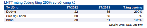 HSC nâng lần lượt 14,3%, 22,1% và 23,4% dự báo doanh thu mảng đường trong giai đoạn 2023-2025 sau khi điều chỉnh tăng dự báo sản lượng tiêu thụ (giữ nguyên dự báo giá bán bình quân), tương đương tăng trưởng lần lượt 67,4%, 12,9% và 6,5%. Sau khi nâng dự báo doanh thu, chúng tôi nâng 27-33% dự báo LNTT trong giai đoạn 2023-2025, tương đương tăng trưởng lần lượt 79,3%, 14,2% và 9,8%.