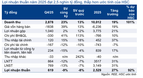 Lợi nhuận thuần Q4/2025 đạt 619 tỷ đồng (giảm 9% cùng kỳ và giảm 8% so với quý trước). Tính chung 12 tháng, lợi nhuận thuần đạt 2,5 nghìn tỷ đồng (tăng trưởng 27%) và bằng 92% dự báo cả năm của HSC. Trong năm 2025, tăng trưởng lợi nhuận thuần chủ yếu đến từ mảng năng lượng nhờ điều kiện thời tiết thuận lợi, qua đó mang lại KQKD tích cực cho các nhà máy thủy điện, và mức độ tham gia cao hơn vào thị trường phát điện cạnh tranh. Lợi nhuận thuần từ mảng năng lượng đạt 1,4 nghìn tỷ đồng (tăng trưởng 40%) nhờ sản lượng tiêu thụ thủy điện tăng 30%. Các nhà máy điện dự kiến được bổ sung trong 2 năm tới vào danh mục của REE bao gồm: