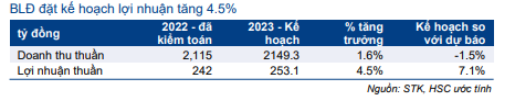 Trong năm 2023, HSC dự báo doanh thu thuần đạt 2.182 tỷ đồng, tăng trưởng 3,2% và lợi nhuận thuần là 236 tỷ đồng, giảm 2,4% so với cùng kỳ, thấp hơn 6,6% so với kế hoạch của BLĐ. Chúng tôi duy trì quan điểm năm 2023 sẽ rất khó khăn đối với STK do nhu cầu thấp trên toàn cầu.