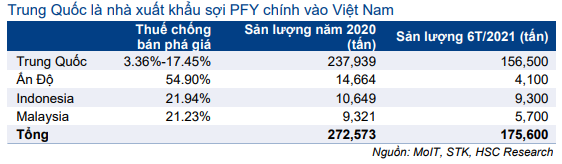 Theo Bộ Công Thương, sản lượng nhập khẩu sợi PFY từ Trung Quốc, Ấn Độ, Indonesia và Malaysia đã tăng lên 300.000 tấn trong năm 2019 từ 189.262 tấn trong năm 2017. Theo đó nhập khẩu từ các nước này tương đương với 55% nhu cầu sợi PFY trong nước năm 2019 theo ước tính của chúng tôi. Trong 6 tháng đầu năm 2021, sản lượng nhập khẩu từ các nước này là 175.600 tấn, chiếm 68% sản lượng sợi PFY nhập khẩu vào Việt Nam ở mức 258.000 tấn, tăng 37% so với cùng kỳ.