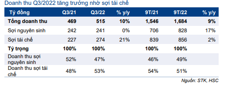 Doanh thu thuần Q3/2022 tăng 10% so với cùng kỳ đạt 515 tỷ đồng, chủ yếu nhờ doanh thu sợi tái chế tăng 21% so với cùng kỳ, trong khi doanh thu sợi nguyên sinh đi ngang so với cùng kỳ. Theo STK, doanh thu sợi tái chế tăng chủ yếu nhờ giá bán cải thiện. Giá bán bình quân của sợi tái chế tăng 13% so với cùng kỳ trong Q3/2022. Trong khi đó, giá bán bình quân của sợi nguyên sinh gần như đi ngang so với cùng kỳ.