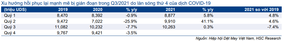 Do đó, kim ngạch xuất khẩu của ngành dệt may Việt Nam vẫn đi ngang so với cùng kỳ trong Q3/2021 so với tăng mạnh 41,1% so với cùng kỳ trong Q2/2021. So với mức trước đại dịch, kim ngạch xuất khẩu trong Q3/2021 giảm 7,3% so với Q3/2019, trong khi kim ngạch xuất khẩu trong nửa đầu năm 2021 đã hồi phục và tăng 5% so với cùng kỳ 2019 (Bảng 1).