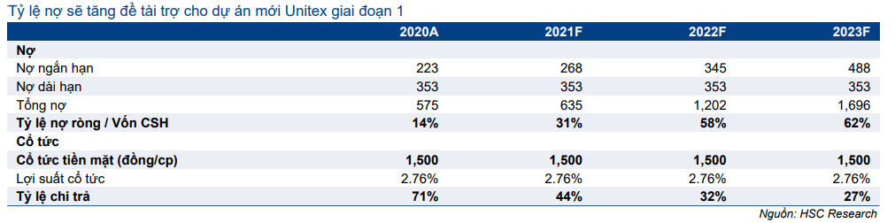 Theo đó, chúng tôi dự báo tỷ lệ nợ thuần/vốn CSH sẽ tăng dần lên 64% vào thời điểm cuối năm 2023 từ 14% vào thời điểm cuối năm 2020 để tài trợ cho dự án Unitex giai đoạn 1. Nếu STK phát hành thành công cổ phiếu mới thông qua phát hành riêng lẻ, tỷ lệ nợ/vốn CSH sẽ thấp hơn so với dự báo hiện tại của chúng tôi.