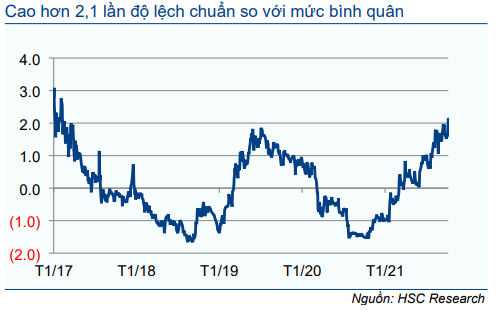 Cổ phiếu hiện đang được giao dịch với P/E dự phóng 2021 và 2022 lần lượt là 13,6 lần và 9,8 lần, tương đương P/E trượt dự phóng 1 năm là 10,5 lần, cao hơn 2,1 lần độ lệch chuẩn so với mức bình quân là 7,1 lần (tính từ tháng 1/2019) sau một giai đoạn tăng giá mạnh (Bảng 15-16).