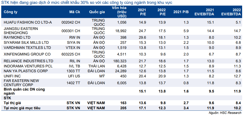Tuy nhiên, với kỳ vọng tăng trưởng lợi nhuận mạnh mẽ – tốc độ tăng trưởng gộp bình quân lợi nhuận thuần trong giai đoạn 2020-2023 sẽ đạt 45,8% – ngoài ra, STK hiện đang giao dịch với định giá thấp hơn 29% so với các công ty cùng ngành trong khu vực (theo P/E dự phóng 2022) (Bảng 17), chúng tôi tin rằng cổ phiếu STK xứng đáng được đánh giá lại. STK là một trong hai công ty duy nhất của Việt Nam có khả năng sản xuất sợi RPF. Với chính sách thuế CBPG mới đối với sợi PFY nhập khẩu, STK sẽ được hưởng lợi từ sản lượng và tỷ suất lợi nhuận tăng.