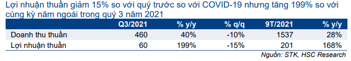 Theo STK, doanh thu thuần và lợi nhuận thuần sơ bộ Q3/2021 lần lượt là 460 tỷ đồng và 60 tỷ đồng, tăng lần lượt 40% và 199% so với mức nền thấp trong năm 2020 nhưng lần lượt giảm 10% và 15% so với quý trước (Bảng 2).