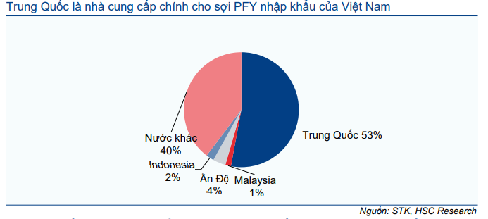 Sợi PFY nhập khẩu từ Trung Quốc, Ấn Độ, Indonesia và Malaysia chiếm khoảng 60- 70% tổng sản lượng sợi PFY nhập khẩu của Việt Nam hàng năm. Trong đó, Trung Quốc là nhà cung cấp chính, đóng góp 50-55% tổng sản lượng sợi PFY nhập khẩu của Việt Nam với khoảng 40% thị phần sợi PFY tại Việt Nam.
