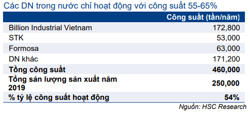 Bảng 5: Công suất sản xuất của các DN nội địa tại Việt Nam