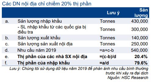 - Tổng công suất của các công ty trong nước là 460.000 tấn, tương đương 90% tổng nhu cầu là 550.000 tấn/năm. Tuy nhiên, do hoạt động bán phá giá, các nhà cung cấp trong nước chỉ chiếm khoảng 20% thị phần, trong khi sản lượng nhập khẩu chiếm 80% tổng sản lượng tiêu thụ (Bảng 5-6). Trong đó, chúng tôi ước tính sợi PFY nhập khẩu của Trung Quốc chiếm khoảng 40% thị phần.