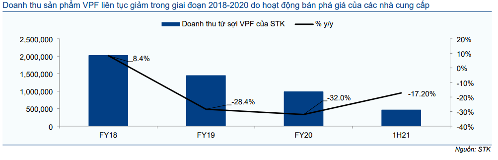 - Sợi nguyên sinh: Doanh thu từ sợi polyester nguyên sinh (VPF) của STK bị ảnh hưởng bởi hoạt động bán phá giá của các nhà cung cấp Trung Quốc trong những năm gần đây. Doanh thu sản phẩm này liên tục giảm trong giai đoạn 2018-2020. Trong 6 tháng đầu năm 2021, doanh thu từ sợi nguyên sinh của STK giảm 17% so với cùng kỳ xuống còn 465 tỷ đồng, trong khi sản lượng nhập khẩu của Việt Nam từ Trung Quốc tăng 21% so với cùng kỳ như đã đề cập ở trên.