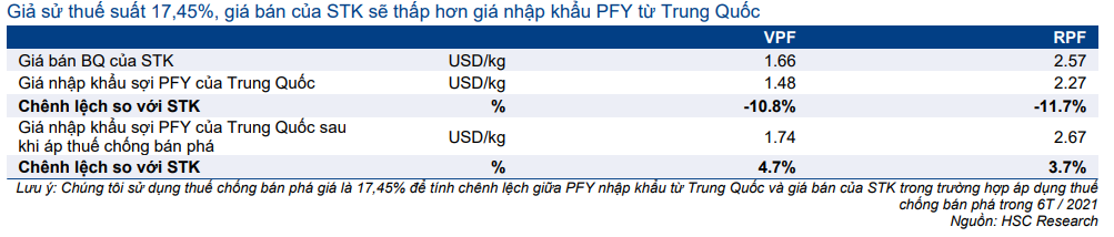 Theo STK, giá nhập khẩu bình quân của các sản phẩm sợi PFY từ Trung Quốc trong 6 tháng đầu năm 2021 thấp hơn 10-12% so với giá bán của STK. Do 90% sản phẩm của Trung Quốc hiện phải chịu thuế suất CBPG là 17,45%, chúng tôi ước tính giá nhập khẩu của Trung Quốc sau khi trả thuế CBPG sẽ cao hơn 4-5% so với giá bán của STK. Nhờ đó, STK có thể cải thiện sản lượng tiêu thụ cả sợi nguyên sinh và sợi tái chế: