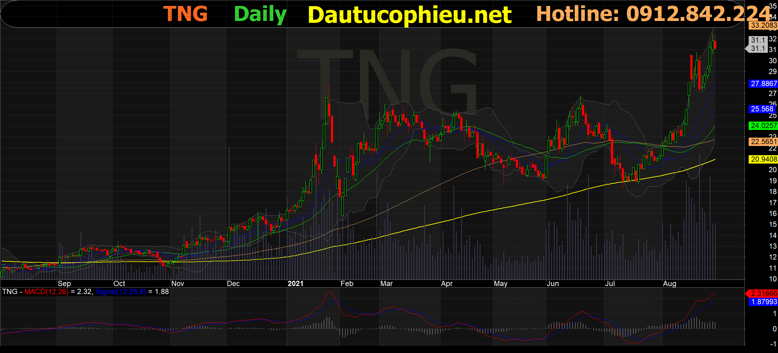 Đồ thị cổ phiếu TNG phiên giao dịch ngày 30/08/2021. Nguồn: AmiBroker
