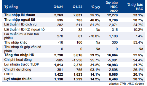 TPB đã công bố KQKD Q1/2022 với lợi nhuận thuần tăng 14,2% so với cùng kỳ đạt 1.299 tỷ đồng, nhờ tổng thu nhập HĐ (tăng 29,2% so với cùng kỳ) tăng mạnh mặc dù chi phí HĐ (tăng 25,7% so với cùng kỳ) và chi phí dự phòng (tăng 93,1% so với cùng kỳ) cũng tăng mạnh. Lợi nhuận Q1/2022 thấp hơn một chút so với kỳ vọng và bằng 20% dự báo của HSC cho cả năm 2022.