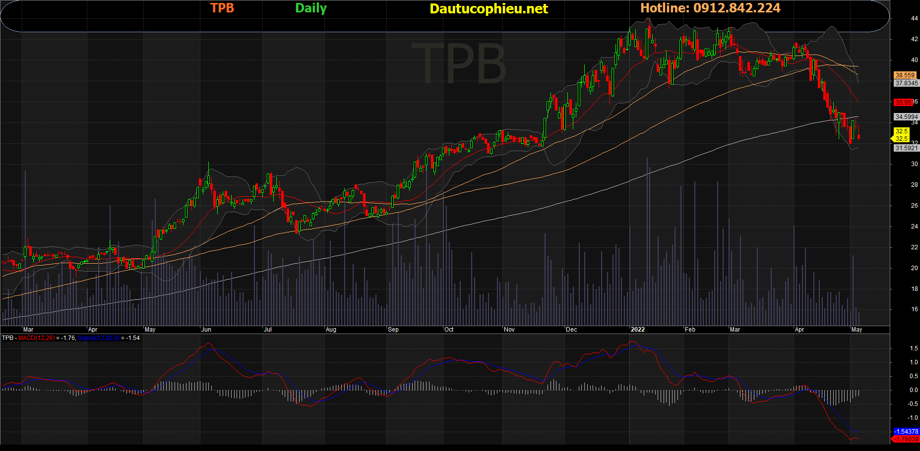 Đồ thị cổ phiếu TPB phiên giao dịch ngày 09/05/2022. Nguồn: AmiBroker