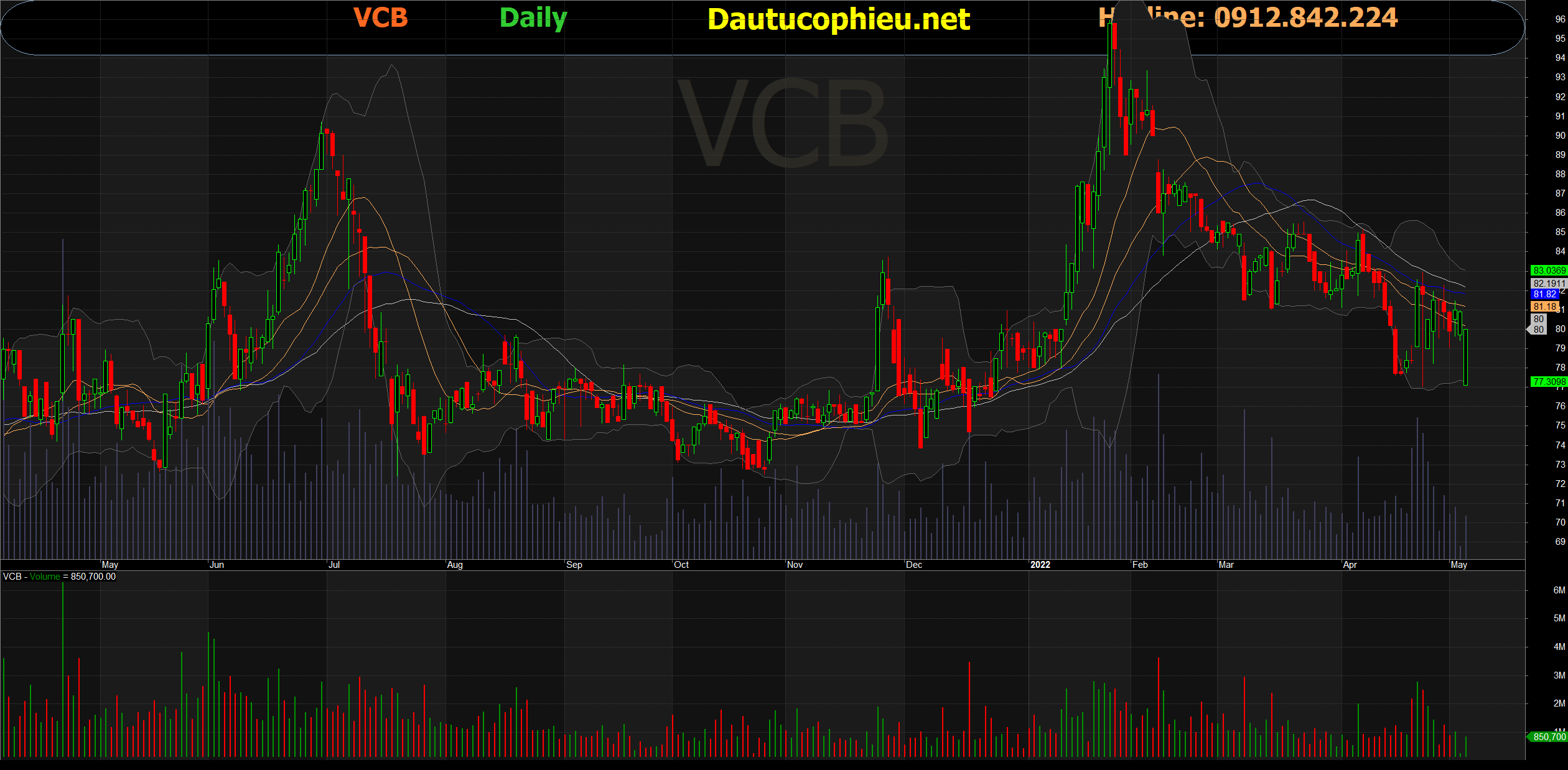 Đồ thị cổ phiếu VCB phiên giao dịch ngày 10/05/2022. Nguồn: AmiBroker